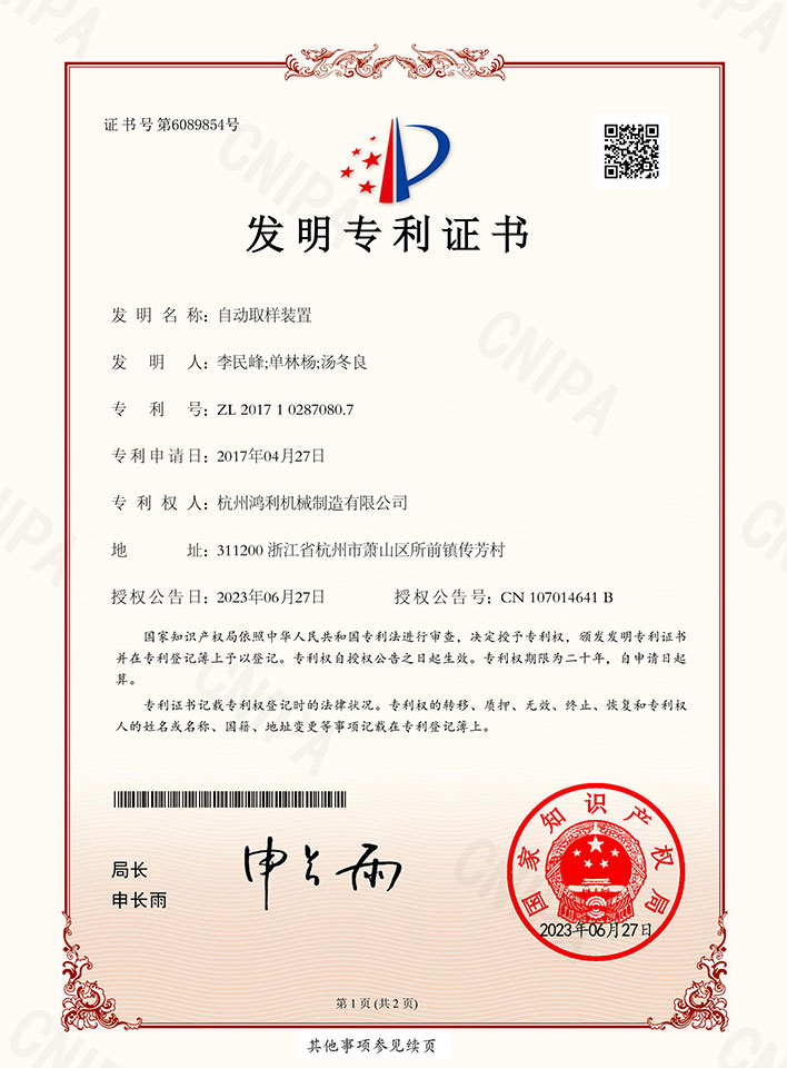 自動取樣裝置-專利證書(發明)