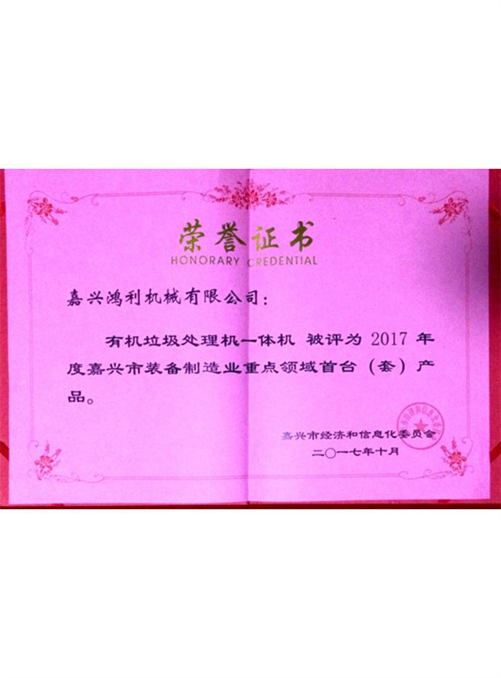 垃圾處理設備嘉興市首臺套證書