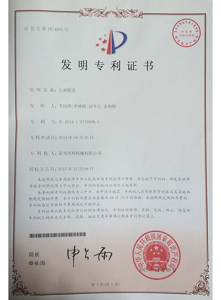 分離裝置發明專利證書