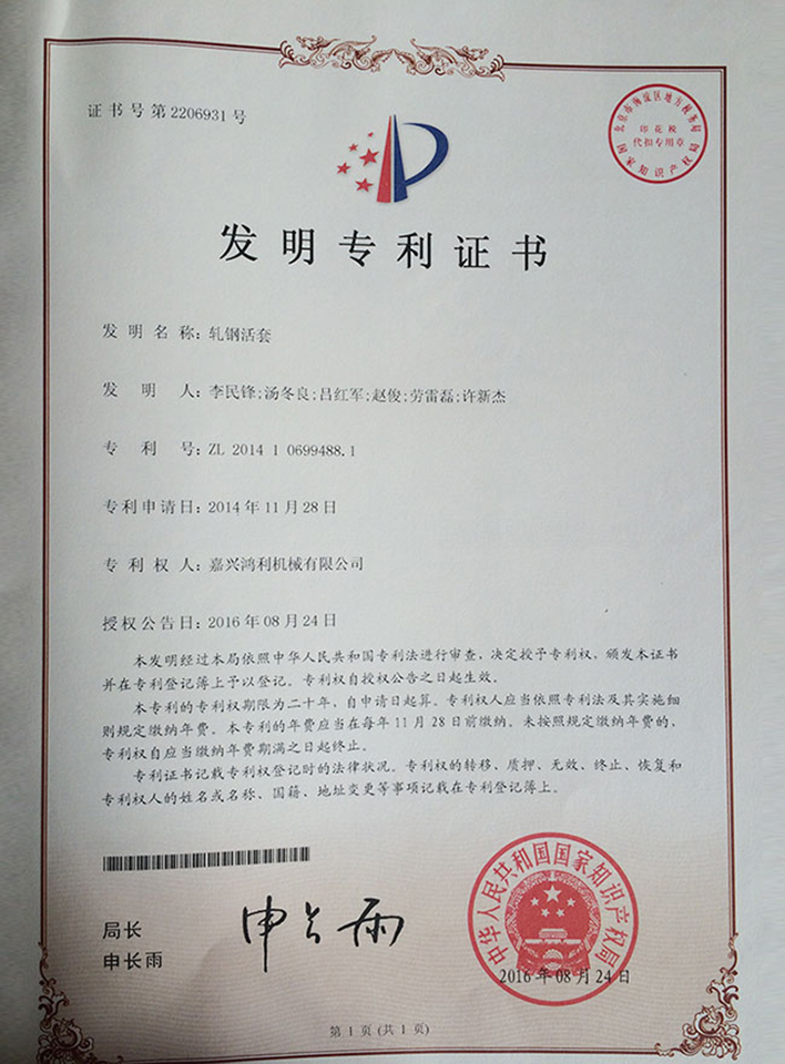 軋鋼活套發明專利證書