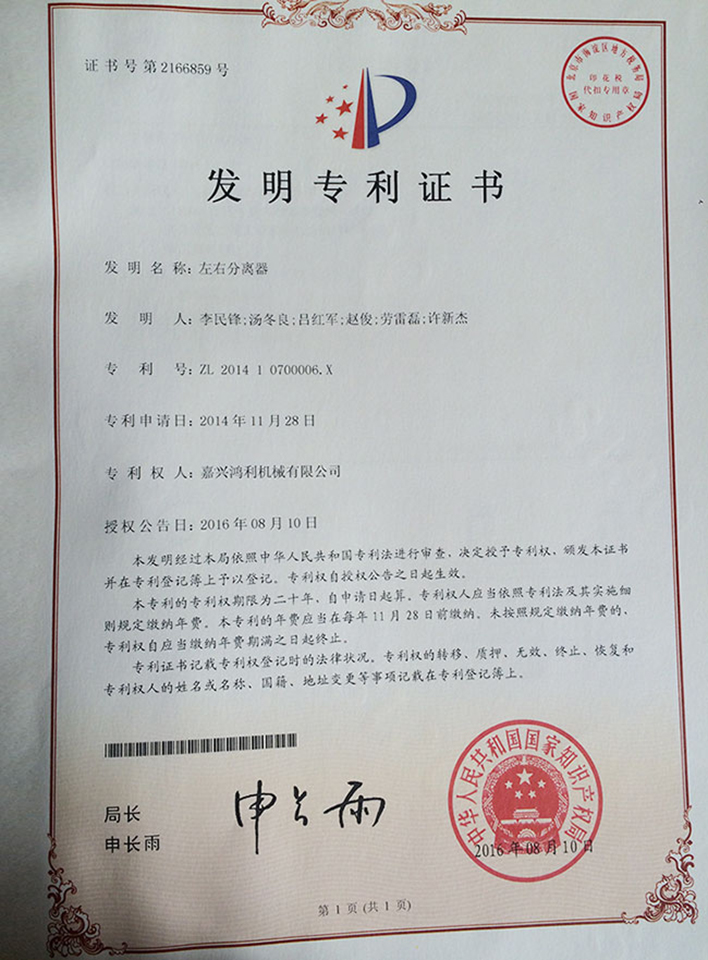 左右分離器發明專利證書