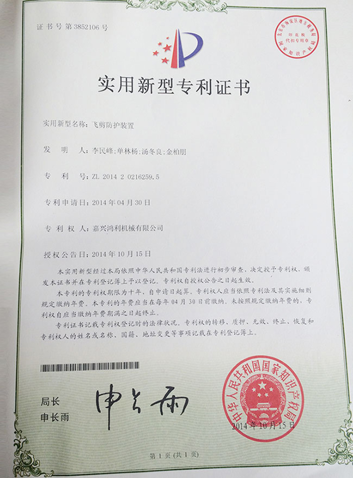 飛剪防護裝置發明專利證書