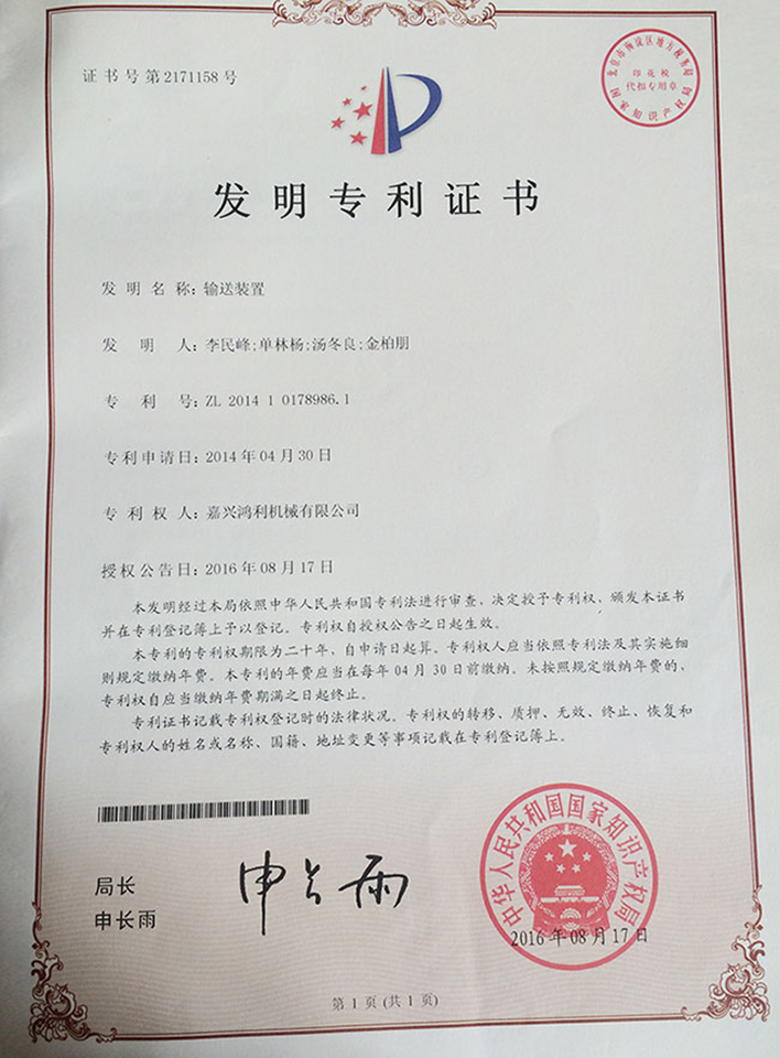 輸送裝置發明專利證書