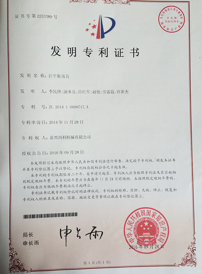 自平衡吊具發明專利證書